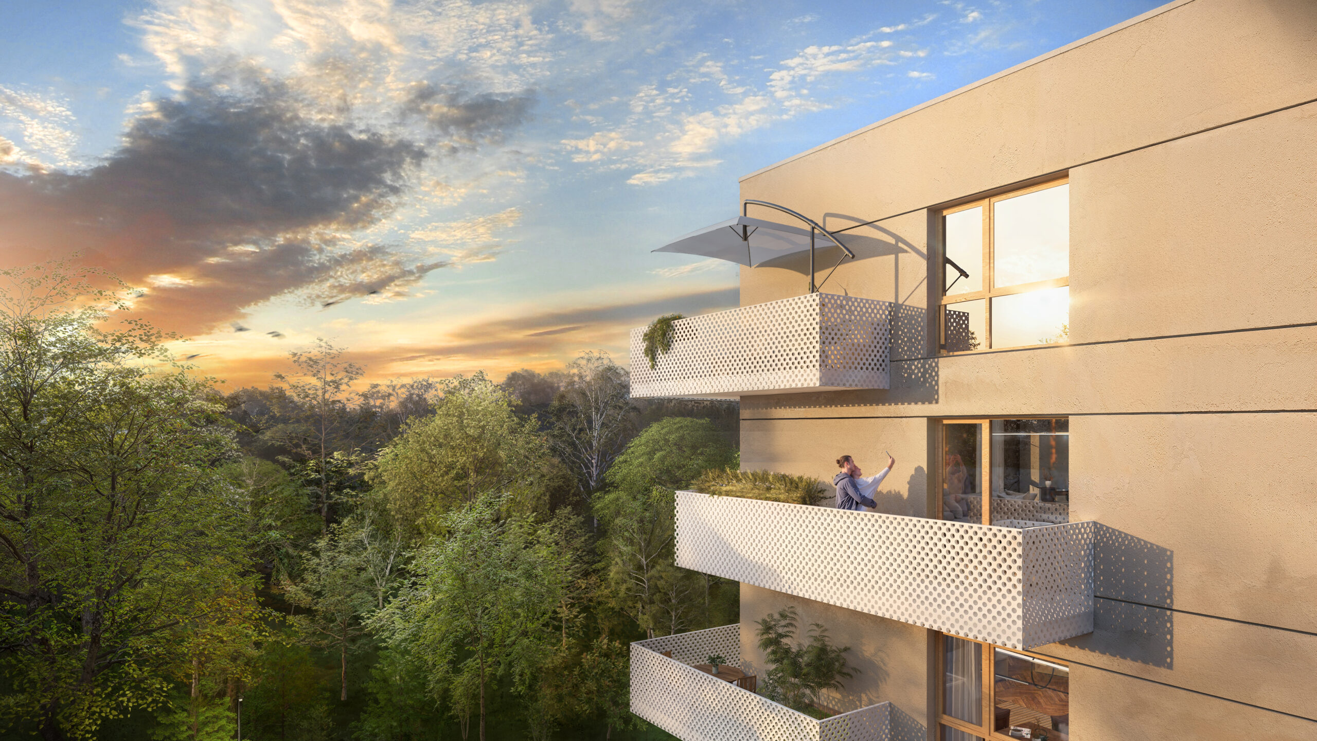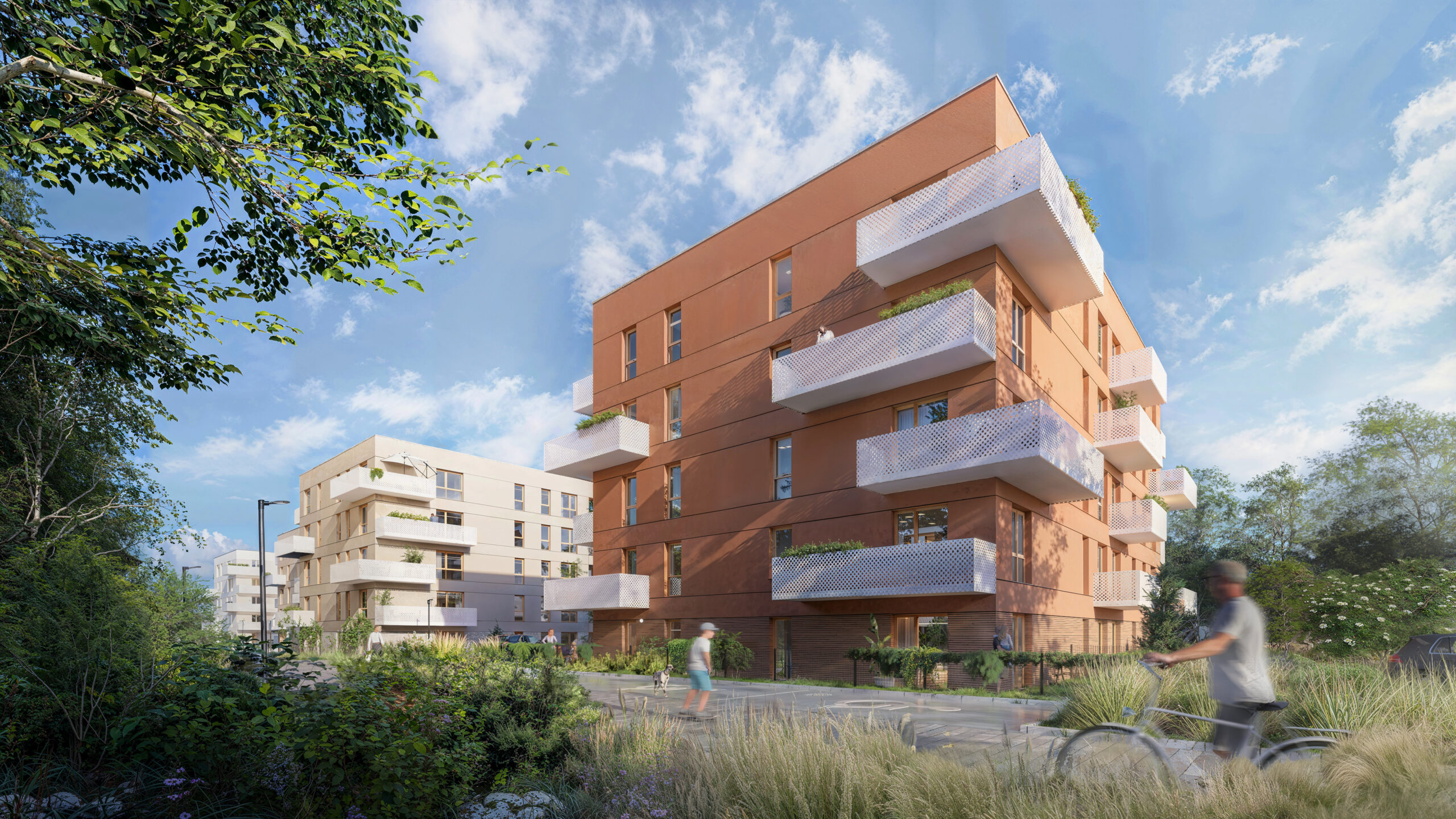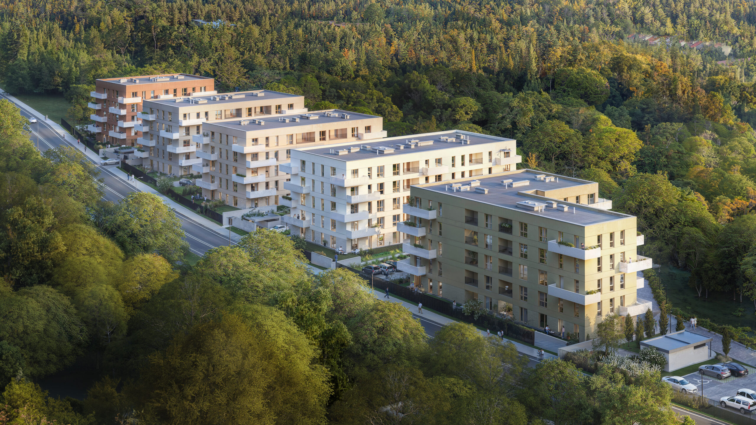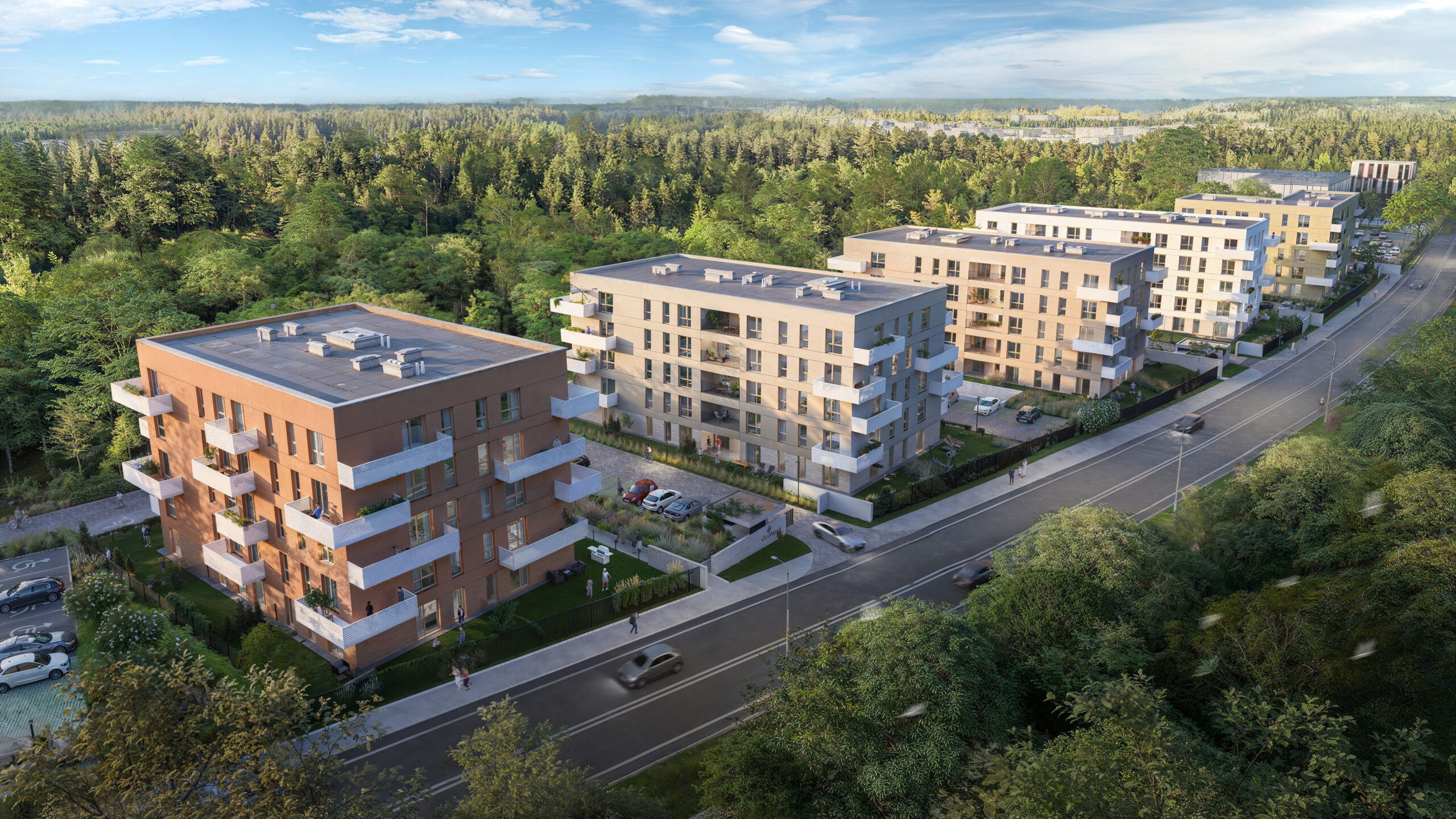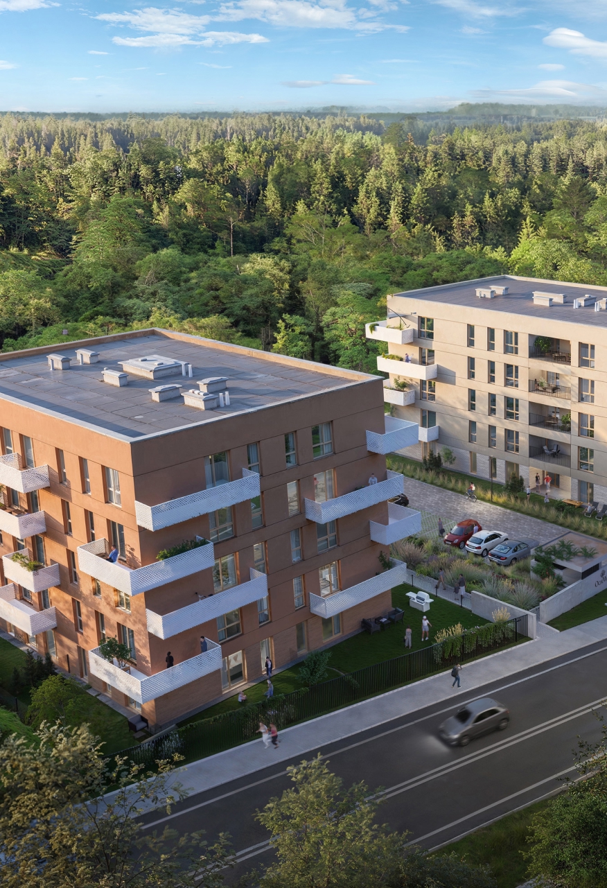 W pięciu kameralnych budynkach powstaną mieszkania z prywatnymi zielonymi tarasami na parterze oraz przestronnymi balkonami i tarasami na piętrach. Znajdziesz wśród nich swoje idealne miejsce do życia – funkcjonalną kawalerkę, wygodne dwu lub trzypokojowe mieszkanie dla Twojej rodziny, a może przestronny apartament.